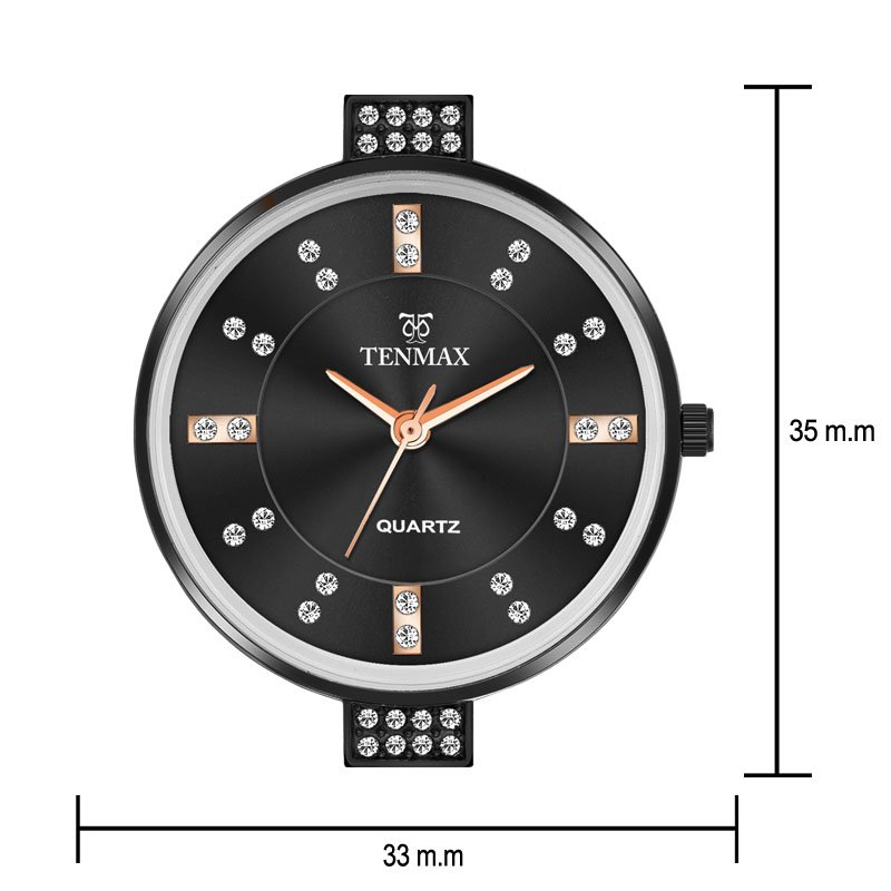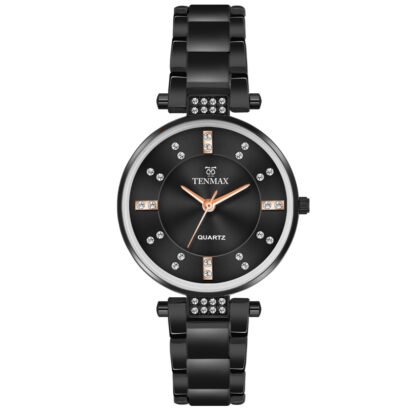 Introducing the Tenmax Quartz D-13, a masterpiece of elegance and sophistication. This women’s analog watch features a striking black dial adorned with rose gold hands and diamond hour markers for a touch of luxury. The 16 mm black chain, complemented by divers extension clasps, ensures a perfect fit and timeless style. Ideal for adding a refined, yet modern touch to any ensemble.